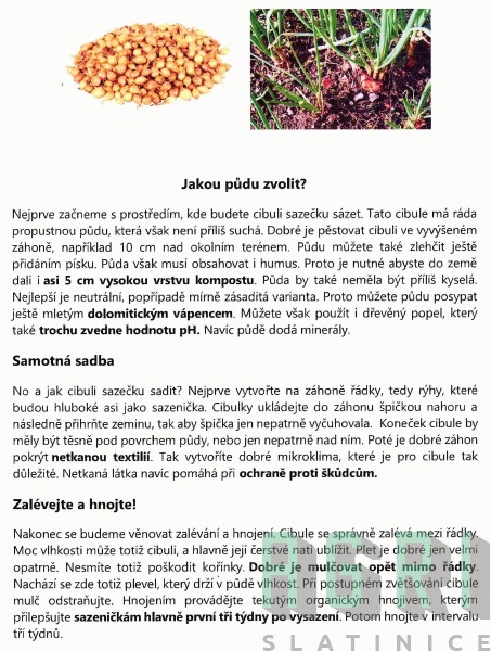 RED SUN -  Sazečku je nutné skladovat na suchém chladném místě. Před výsadbou se doporučuje sazečku cibule namořit proti houbovým chorobám. Půda by měla být propustná, dobře zpracovaná s dostatečnou dávkou živin. Cibule však nesnáší přímé hnojení chlévským hnojem. Sázíme do řádků 25 - 30 cm vzdálených, v řádcích na vzdálenost 10 cm a do hloubky cca 3 cm. Cibule obsahuje éterické oleje, je bohatá na sacharidy, vápník, železo a fosfor. Působí antiastmaticky, antibakteriálně, antisepticky. Snižuje krevní tlak a hladinu cholesterolu.