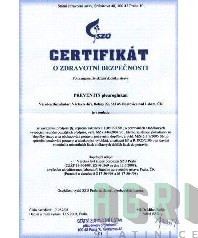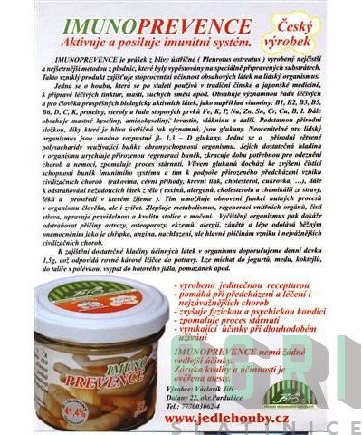 IMUNOPREVENCE je mikronizovaný prášek z hlívy ústřičné ( Pleurotus ostreatus ) vyrobený nejčistší a nejšetrnější metodou z plodnic, které byly vypěstovány na speciálně připravených ekologických substrátech. Takto vzniklý produkt zajišťuje 100% účinnost obsahových látek na lidský organismus. Celý proces od vypěstování hub až po zabalení do prodejních obalů je prováděn pod dohledem kontrolní organizace, čímž je pro Vás zákazníky zaručena kvalita a účinnost produktu.  Charakteristika: Jedná se o houbu, která se po staletí používá v tradiční čínské a japonské medicíně, k přípravě tinktur, mastí, suchých směsí, extraktů, výluhů apod.sloužících pro zajištění správných funkcí lidského, ale i zvířecího organismu. Obsahuje významnou řadu pro člověka prospěšných biologicky aktivních látek, jako například vitamíny: B1, B2, B3, B5, B6, D, C, K, proteiny, steroly a řadu stopových prvků Fe, K, P, Na, Zn, Sn, Cr, Cu, B, I. Dále obsahuje mastné kyseliny, aminokyseliny, lovastin, vlákninu a další. Podstatnou přírodní složkou díky které je hlíva ústřičná tak významná, jsou glukany. Neocenitelné pro lidský organismus jsou snadno rozpustné ß- 1,3 – D glukany. Jedná se o přírodní větvené polysacharidy, které využívají buňky obranyschopnosti. Jejich dostatečná hladina v organismu urychluje přirozenou regeneraci buněk, zkracuje dobu potřebnou pro odeznění chorob a nemocí, zpomaluje proces stárnutí. Vlivem glukanů dochází ke zvýšení čistící schopnosti buněk imunitního systému a tím k podpoře přirozeného předcházení vzniku civilizačních chorob. Dochází k odstraňování nežádoucích látek s těla ( toxinů, alergenů a chemikálií ze stravy, léků a prostředí ve kterém žijeme ). Tím umožňuje obnovení funkcí nutných pochodů v organismu člověka i zvířat. Zlepšuje metabolismus, čistí střeva, upravuje pravidelnost a kvalitu stolice a močení. Vyčištěný organismus pak dokáže odstraňovat příčiny artrozy, osteoporozy, ekzemů, alergií, zánětů a lépe odolává běžným onemocněním jako je chřipka, angina, nachlazení, ale hlavně příčinám vzniku nejvážnějších civilizačních chorob.   Složení: želatinová kapsle obsahuje 250mg mikronizovaného prášku BIO Hlívy ústřičné. Dávkování: Dospělí : 2 tobolky denně, děti 3-12 let: 1 tobolka denně.