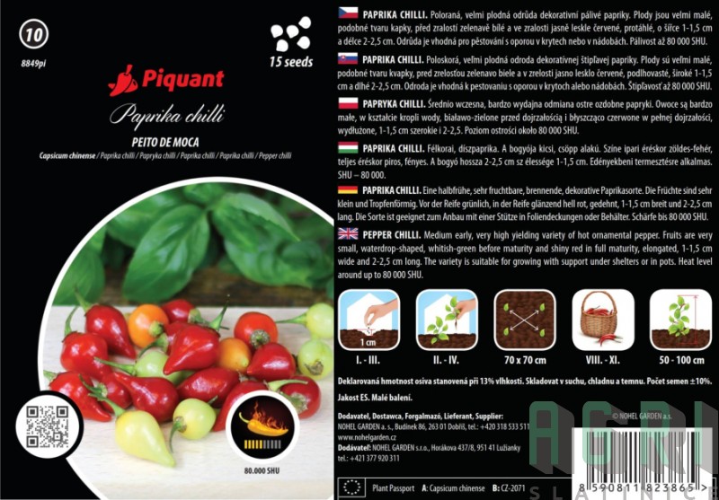 Chilli PEITO DE MOCA je tradiční brazilská odrůda chilli papriček, která se vyznačuje svými malými, srdcovitými plody. Papričky dozrávají z jasně zelené do sytě červené barvy a mají jemně kouřovou, ovocnou chuť s příjemnou pálivostí na úrovni až 80.000 SHU. Rostlina je nenáročná na pěstování, dobře roste i v nádobách a při dostatku slunce přináší bohatou úrodu. Díky své výrazné chuti a střední pálivosti jsou papričky ideální pro milovníky pikantních pokrmů