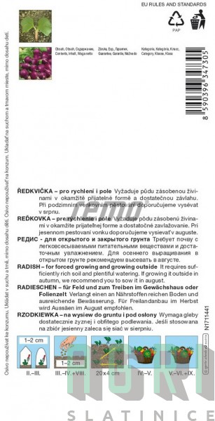 Ředkvička Purpura F1 je velmi raná hybridní fialová ředkvička pro celoroční pěstování. Od starší nehybridní odrůdy Liliana se liší mírně tmavší fialovou barvou bulviček, které jsou také větší a tvarově i velikostně vyrovnanější. Jedná se o velmi raný hybrid, který je vhodný i pro časné jarní rychlení. Díky odolnosti k vybíhání ji můžeme vysévat od časného jara, přes léto až do podzimu.