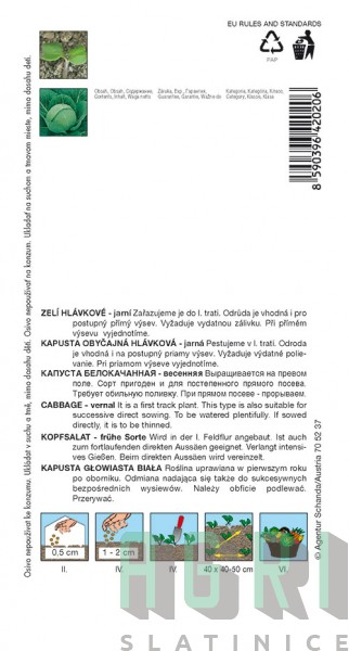 Zelí hlávkové Brassica oleracea convar. Capitata / Kapusta hlávková SLÁVA F1 Raný hybrid určený pro jarní kulturu z předpěstované sadby pro sklizeň v červnu a pro celoroční pěstování z přímého výsevu. Hlávky jsou kulovité, zcela uzavřené, středně husté, odolné vůči praskání, o hmotnosti 0,9 - 1,2 kg. Velikost hlávek je vyrovnaná, mají dobrou odolnost proti vadnutí. Hybrid je odolný proti nízkým teplotám a velmi odolný proti předčasnému vybíhání do květu. Vegetační doba je 110 - 114 dnů od výsevu, 80 - 85 dnů od výsadby. Ze 100 m2 lze sklidit 550 - 650 kg hlávek zelí. Do sklizňové zralosti dorůstá vyrovnaně. Odrůda je vhodná i pro celoroční pěstování s výsevem až do 15.7.
